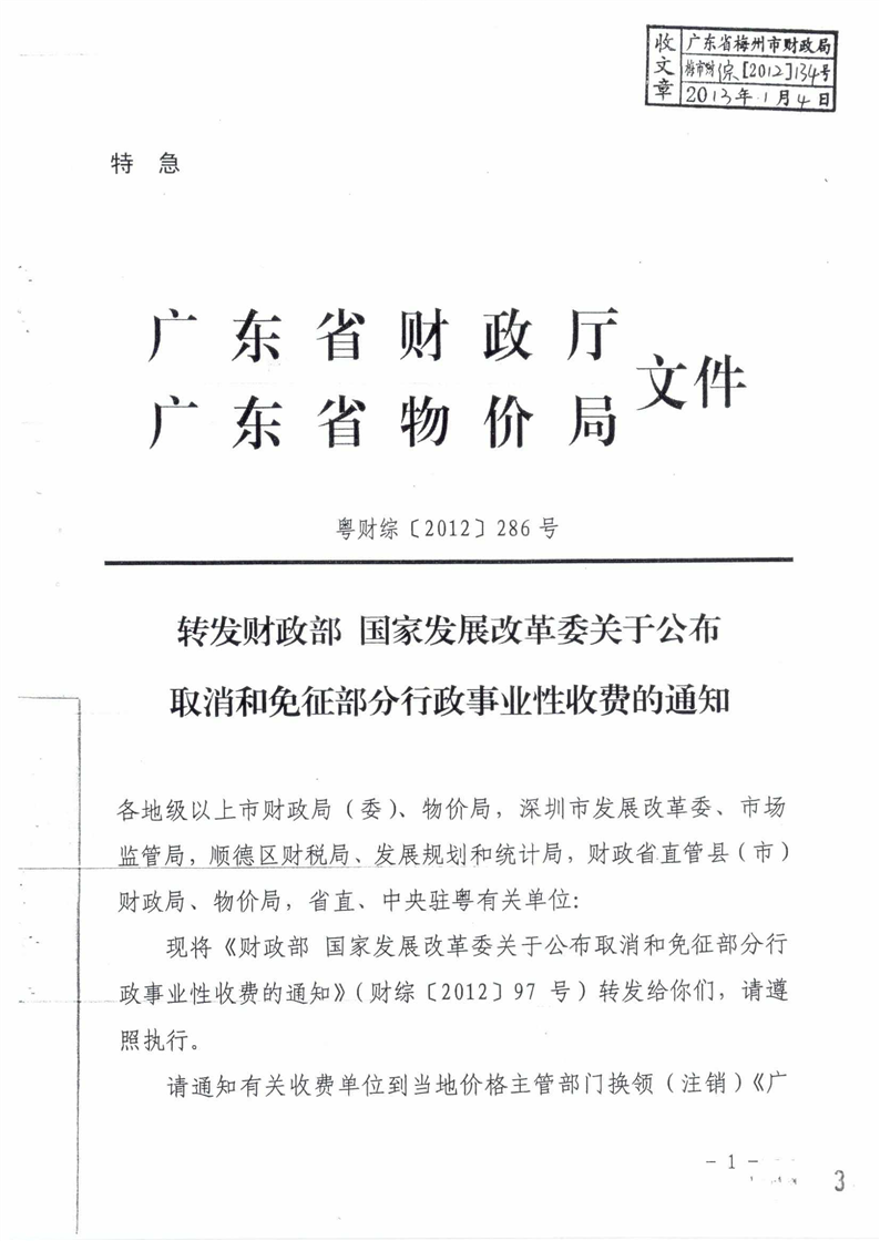 梅市財綜[2013]2號:粵財綜[2012]286號:財綜[2012]97號:轉發省財政廳、省物價局《轉發財政部 國家發展改革委關於公布取消和免征部分行政事業性收費的通知》.pdf