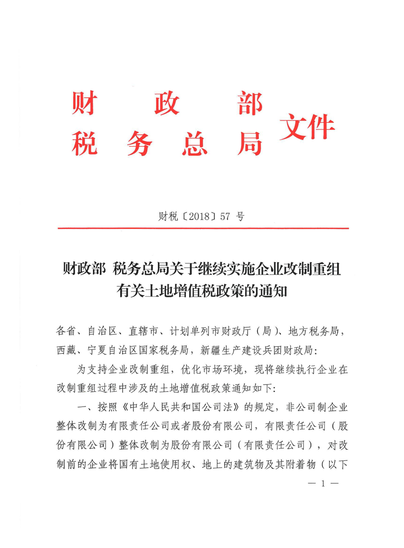 財政部 稅務總局關於繼續實施企業改製重組有關土地增值稅政策的通知