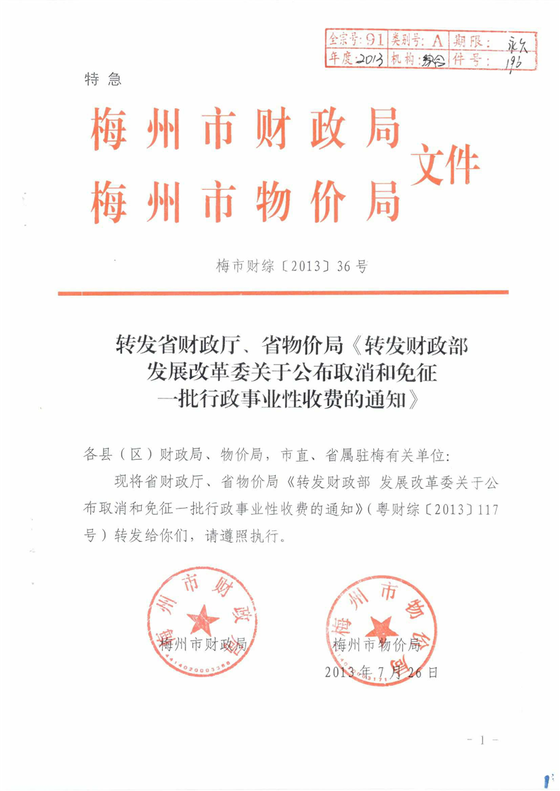 梅州市人民政府門戶網站 梅州市財政局 行政事業性收費及政府性基金 轉發省財政廳、省物價局《轉發財政部 國家發展改革委關於公布取消和免征一批行政事業性收費的通知》梅市財綜[2013]36號