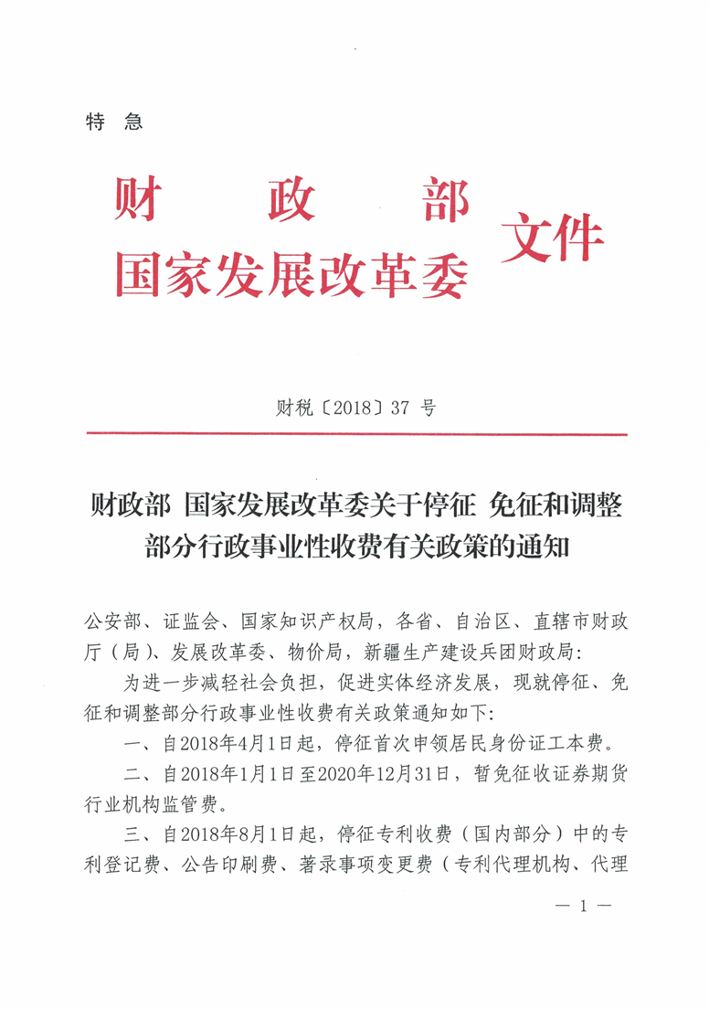 財政部 國家發展改革委關於停征 免征和調整部分行政事業性收費有關政策的通知(財稅〔2018〕37號)