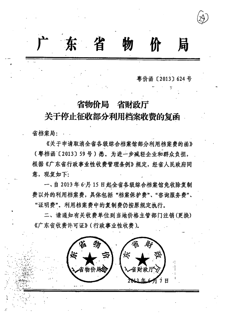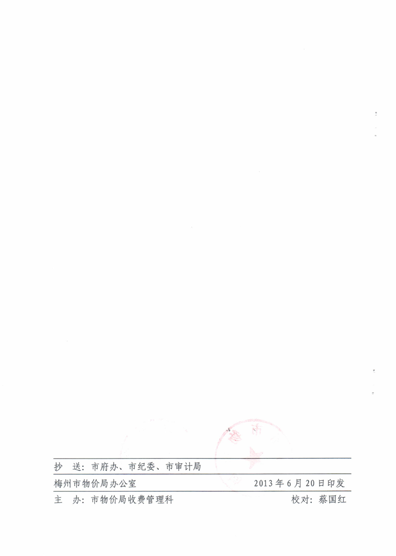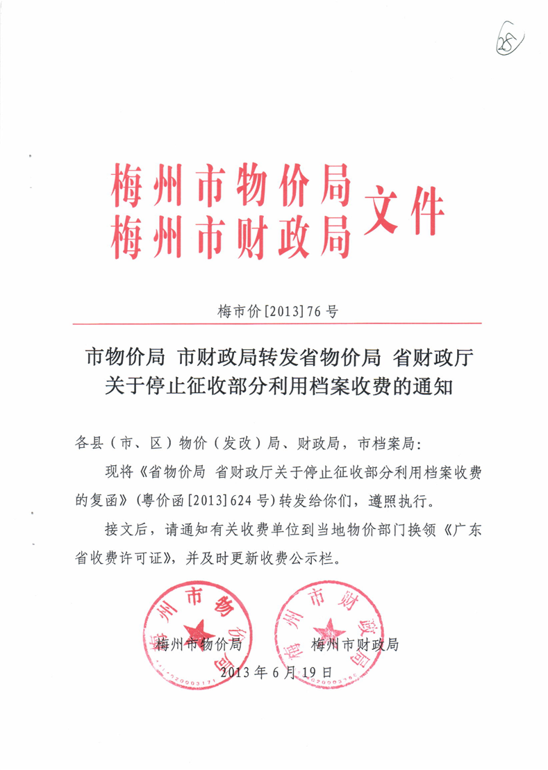 市物價局 市財政局轉發省物價局 省財政廳關於停止征收部分利用檔案收費的通知 梅市價[2013]76號