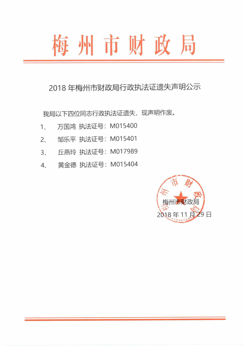 梅州市人民政府門戶網站 梅州市財政局 通知公告 2018年梅州市財政局行政執法證遺失聲明公示