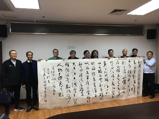 3月24日下午,在容啟東副會長、麥昕主任帶領下,廣東楹聯學會草書委員會一行11人到訪省方誌館,在省人民政府地方誌辦公室黨組成員、副主任丘洪鬆陪同下參觀了廣東省情館。書畫家們一致認為,廣東省情館內容豐富、史料翔實,是展示廣東、講好廣東故事的公共文化場館,是人民群眾了解廣東的窗口和接受省情與愛國主義教育的基地。之後書畫家們在八樓書畫室雅集,並為省方誌館贈送20多幅書畫作品,其中吳壽良老師現場揮豪巨幅毛主席詞――《沁園春・雪》尤其令人震撼。