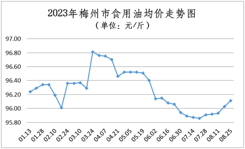 糧油價格小幅上漲。本周糧食均價為3.16元/斤,環比(與8月18日比,下同)上升0.32%;食用油均價為96.11元/桶(5L),環比上升0.08%。
