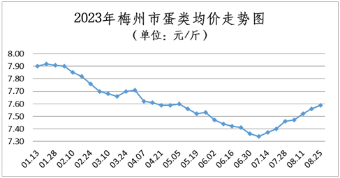 禽蛋價格“一升一降”。監測的禽類均價18.95元/斤,環比下降0.16%;蛋類均價7.59元/斤,環比上升0.4%。