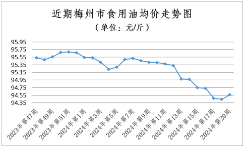 糧油價格微幅波動。本周糧食均價為3.14元/斤,環比(與2024年第19周相比,下同)下降0.32%;食用油均價為94.56元/桶(5L),環比上升0.12%。