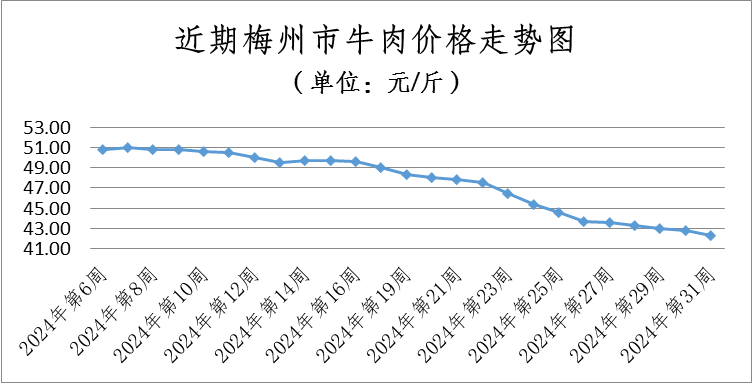 牛肉價格保持下跌態勢。監測的三類牛肉均價為42.28元/斤,環比下降0.52%。其中,牛肉42.29元/斤、腱子肉48.50元/斤,分別環比下降1.08%、0.39%;牛腩36.06元/斤,環比持平。