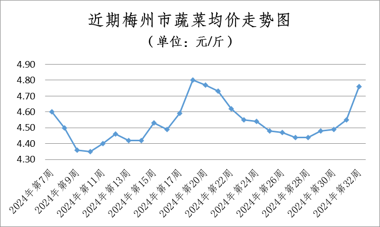 蔬菜價格漲幅擴大。監測的30種蔬菜呈“26升3降1平”,零售均價為4.76元/斤,環比上升4.62%。