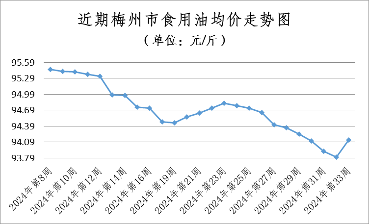 糧油價格保持穩定。本周糧食均價為3.23元/斤,環比(與2024年第32周相比,下同)下降1.53%;食用油均價為94.13元/桶(5L),環比上升0.34%。