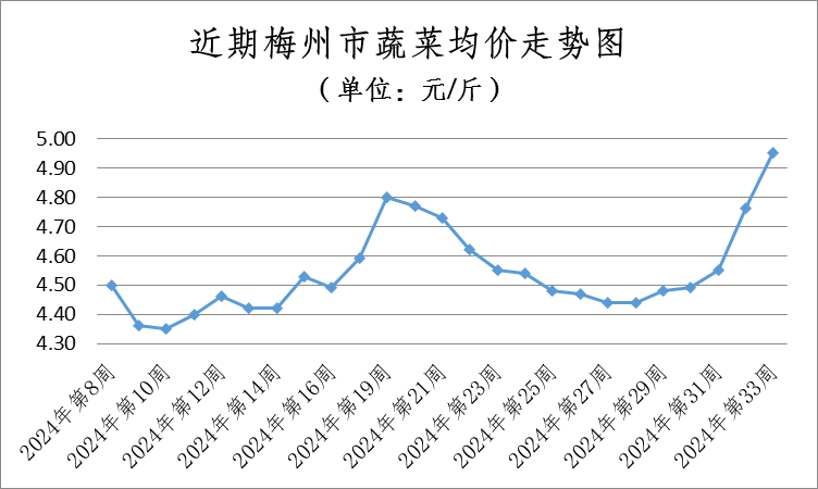 蔬菜價格繼續上漲。監測的30種蔬菜呈“28升2降”,零售均價為4.95元/斤,環比上升3.99%。