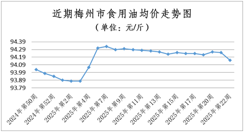 糧油價格基本穩定。本周糧食均價為3.22元/斤,環比(與2025年第21周相比,下同)持平;食用油均價為94.15元/桶(5L),環比微降0.11%。