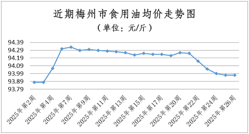 糧油價格基本穩定。本周糧食均價為3.22元/斤,環比(與2025年第25周相比,下同)持平;食用油均價為93.97元/桶(5L),環比持平。