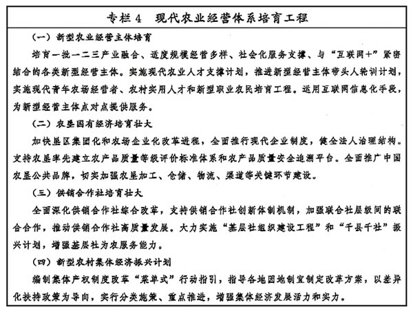 全麵建立職業農民製度,培養新一代愛農業、懂技術、善經營的新型職業農民,優化農業從業者結構。實施新型職業農民培育工程,支持新型職業農民通過彈性學製參加中高等農業職業教育。創新培訓組織形式,探索田間課堂、網絡教室等培訓方式,支持農民專業合作社、專業技術協會、龍頭企業等主體承擔培訓。鼓勵各地開展職業農民職稱評定試點。引導符合條件的新型職業農民參加城鎮職工養老、醫療等社會保障製度。