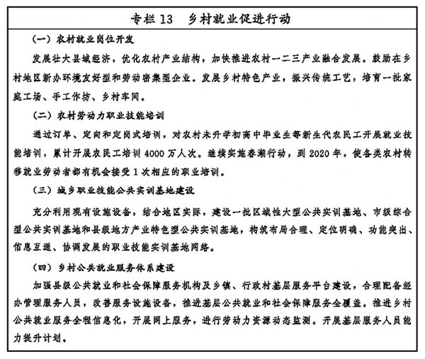 推動形成平等競爭、規範有序、城鄉統一的人力資源市場,建立健全城鄉勞動者平等就業、同工同酬製度,提高就業穩定性和收入水平。健全人力資源市場法律法規體係,依法保障農村勞動者和用人單位合法權益。完善政府、工會、企業共同參與的協調協商機製,構建和諧勞動關係。落實就業服務、人才激勵、教育培訓、資金獎補、金融支持、社會保險等就業扶持相關政策。加強就業援助,對就業困難農民實行分類幫扶。
