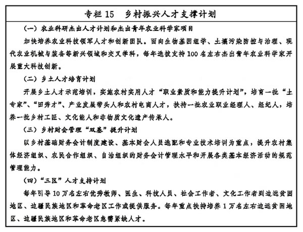 加大“三農”領域實用專業人才培育力度,提高農村專業人才服務保障能力。加強農技推廣人才隊伍建設,探索公益性和經營性農技推廣融合發展機製,允許農技人員通過提供增值服務合理取酬,全麵實施農技推廣服務特聘計劃。加強涉農院校和學科專業建設,大力培育農業科技、科普人才,深入實施農業科研傑出人才計劃和傑出青年農業科學家項目,深化農業係列職稱製度改革。