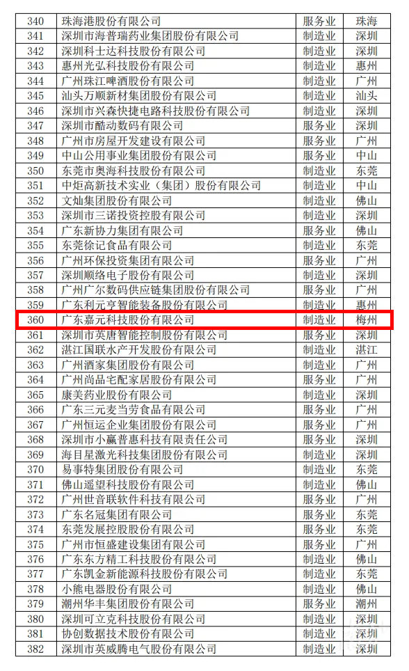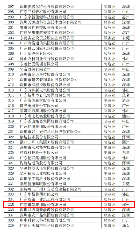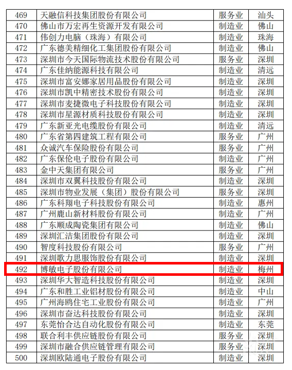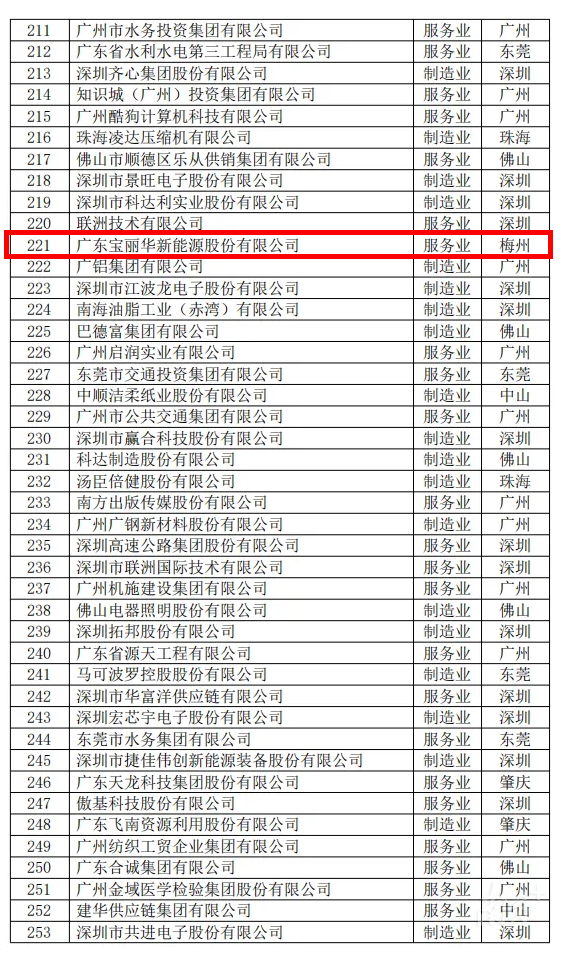 9月20日,廣東省企業聯合會、廣東省企業家協會在廣州召開2024廣東500強企業發展大會,正式向社會發布了“2024廣東企業500強”“廣東民營企業100強”“廣東製造業企業100強”“廣東服務業企業100強”“廣東創新企業100強”等榜單及其分析報告。其中梅州市4家企業上榜“2024廣東企業500強”,分別是廣東寶麗華新能源股份有限公司(排名第221位)、廣東塔牌集團股份有限公司(排名第335位)、廣東嘉元科技股份有限公司(排名第360位)、博敏電子股份有限公司(排名第492位)。