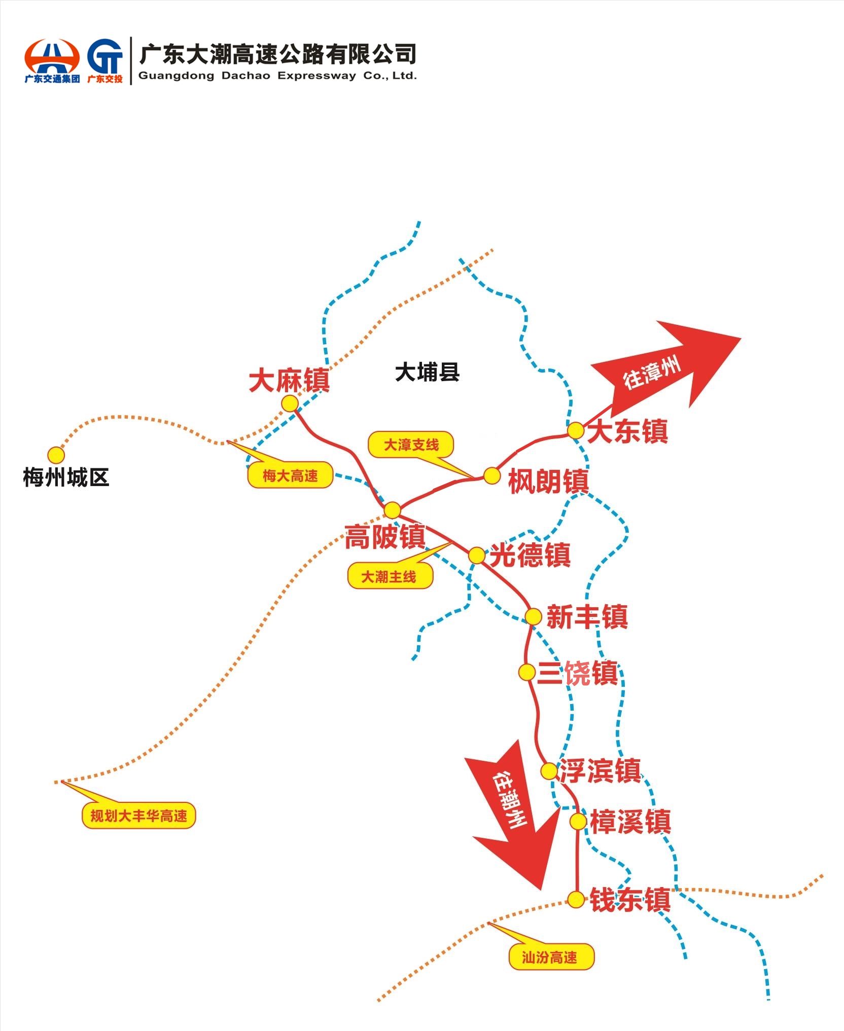 大潮高速北起大埔縣梅大高速,南連潮州市饒平縣沈海高速,並設置支線與福建省的雲平高速對接,是廣東省“十三五”規劃重點項目。路線全長120.77公裏,概算總投資142.79億元,設8處收費站,12處互通立交,2對服務區。