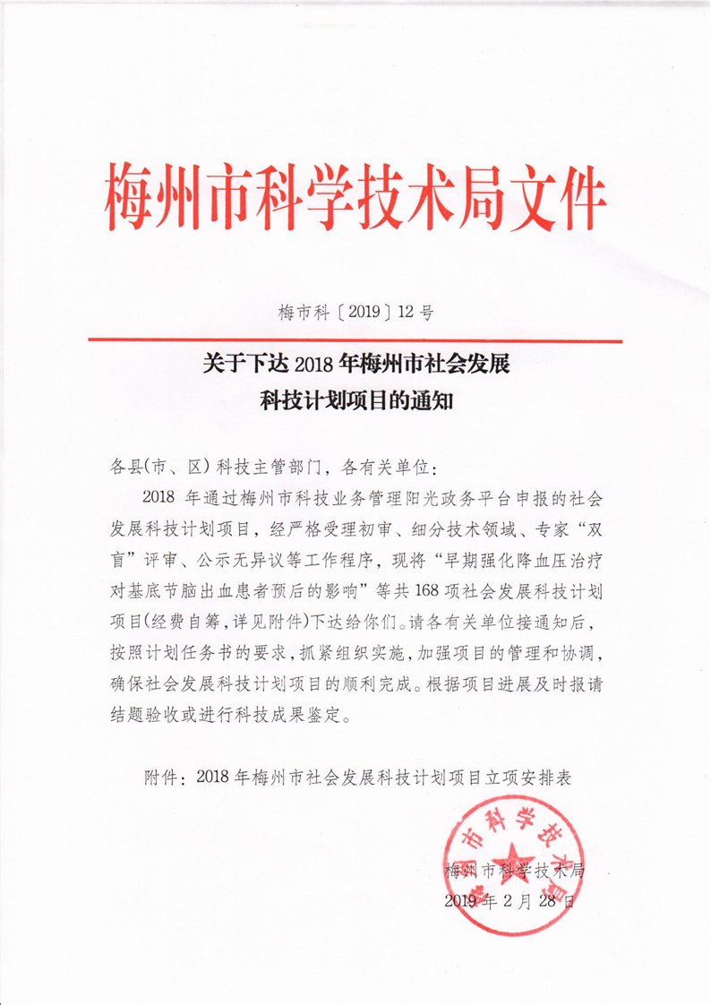 梅州市人民政府門戶網站 梅州市科學技術局 立項信息 關於下達2018年梅州市社會發展科技計劃項目的通知