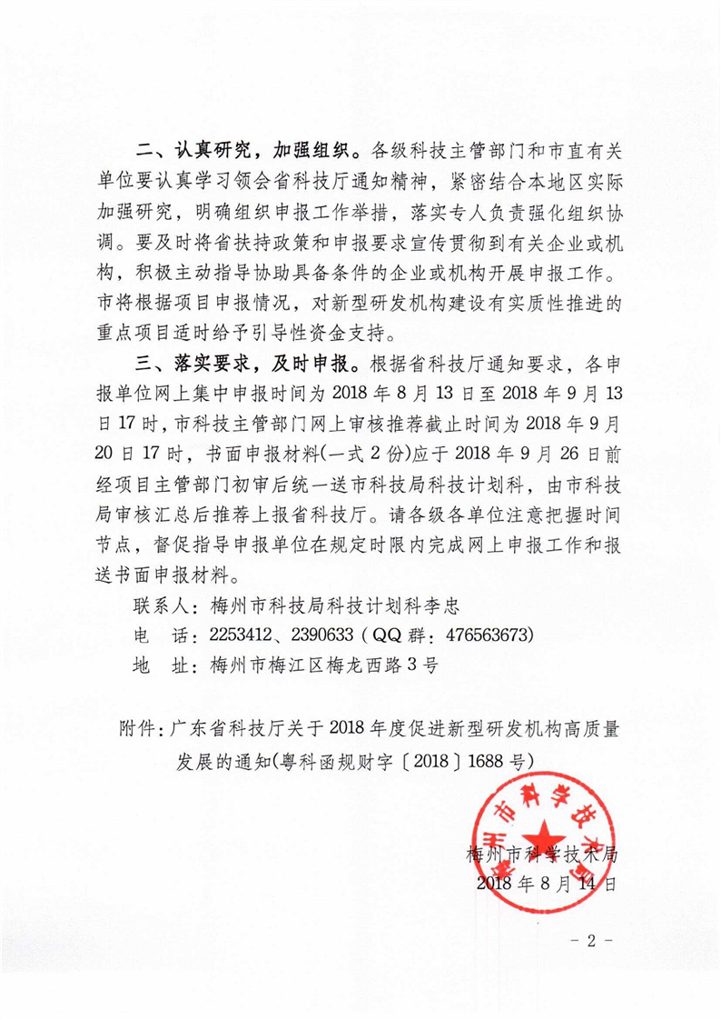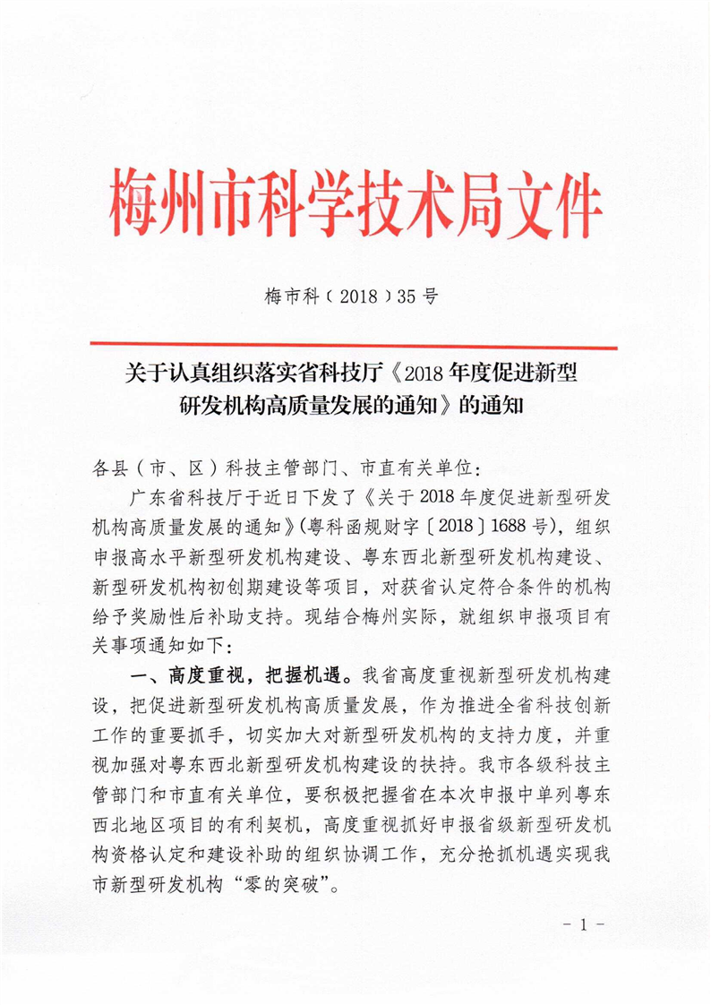 梅州市人民政府門戶網站 梅州市科學技術局 申報指南 關於認真組織落實省科技廳《2018年度促進新型研發機構高質量發展的通知》的通知