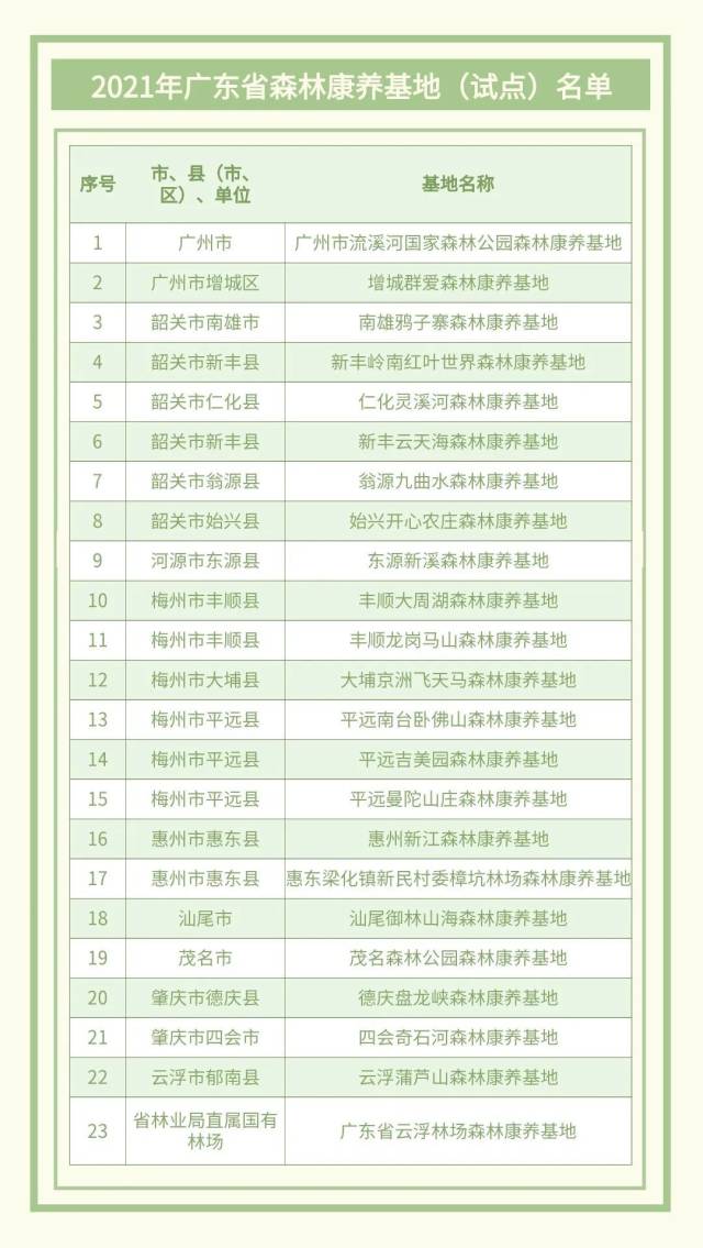 據悉,此次名單全省共有23個基地入選,省林業局將於2年後對本次確定的“廣東省森林康養基地(試點)”建設單位進行複核,對複核合格的授予“廣東省森林康養基地”牌子。
