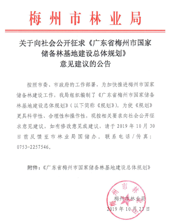 梅州市人民政府門戶網站 梅州市林業局 公示公告 關於向社會公開征求《廣東省梅州市國家儲備林基地建設總體規劃》意見建議的公告