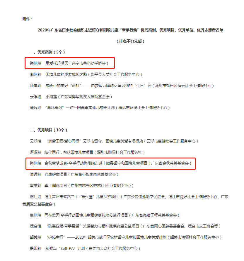 掌上梅州訊 記者從廣東省民政廳獲悉,4月27日,《廣東省民政廳辦公室關於開展2020年百家社會組織走近留守和困境兒童“牽手行動”評優活動的通知》公布,梅州市梅州組2組織,2個人,1項目,1案例入選公示名單。