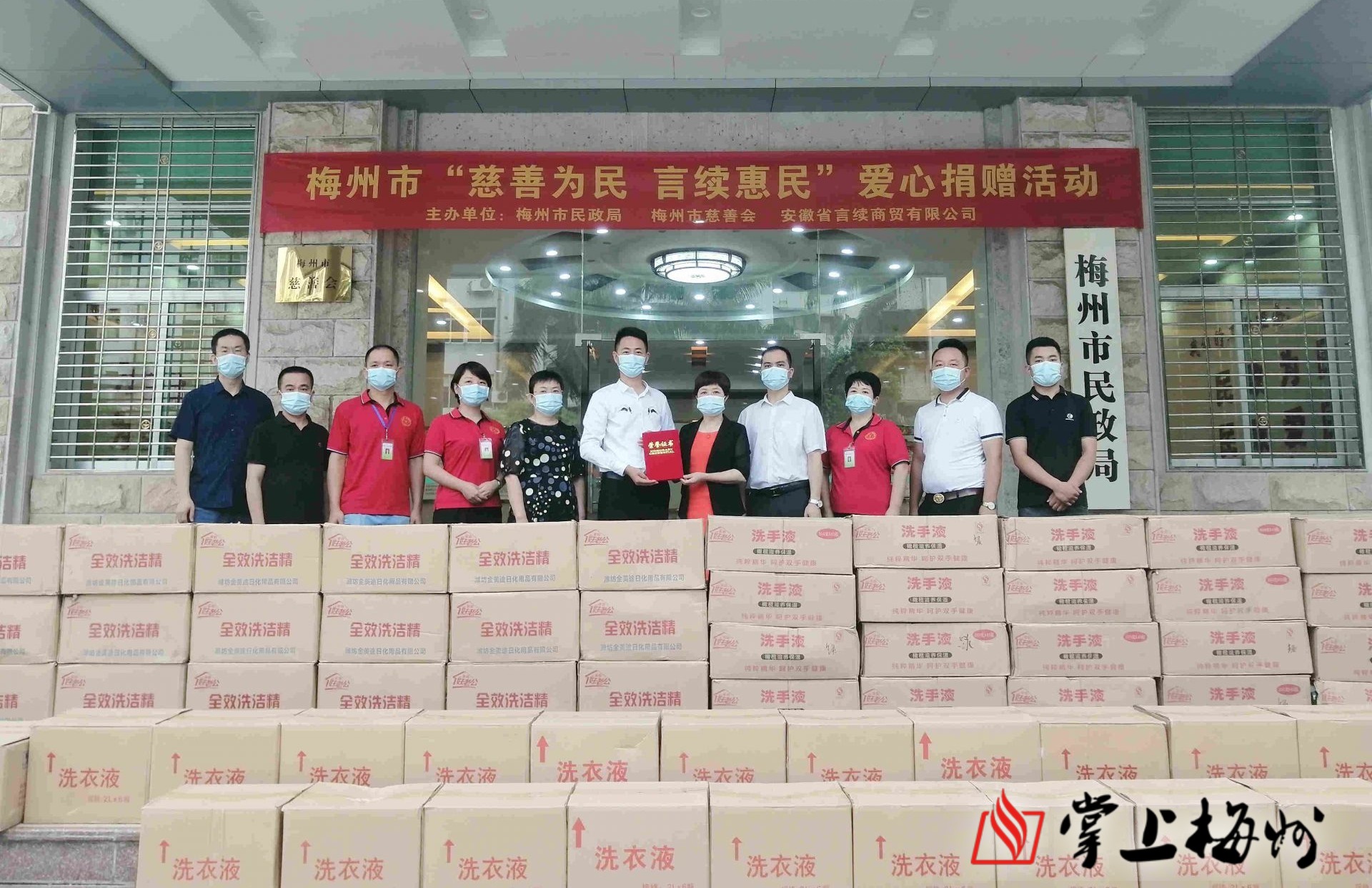 掌上梅州訊 6月22日上午,梅州市“慈善為民 言續惠民”愛心捐贈活動在梅州市民政局舉行。安徽省言續商貿有限公司向全市捐贈一批總價值約280萬元的物資,其中包括洗衣液2500多箱、洗潔精20箱、洗手液2500多箱、84消毒液2500多箱以及太陽能照明燈4088盞。