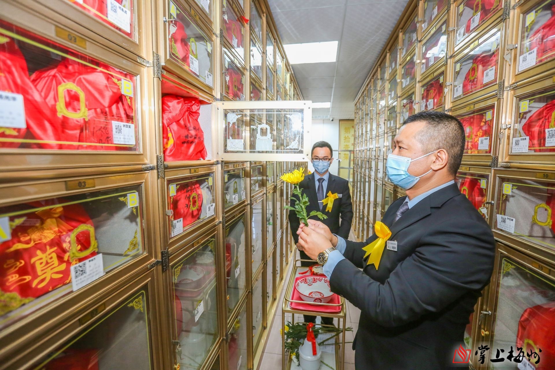 記者在現場看到,儀式結束後,工作人員一行來到骨灰寄存處,擦拭骨灰寄存櫃,對骨灰格位鞠躬行禮,獻上一束菊花,並貼上家屬對逝者飽含思念和愛意的寄語。