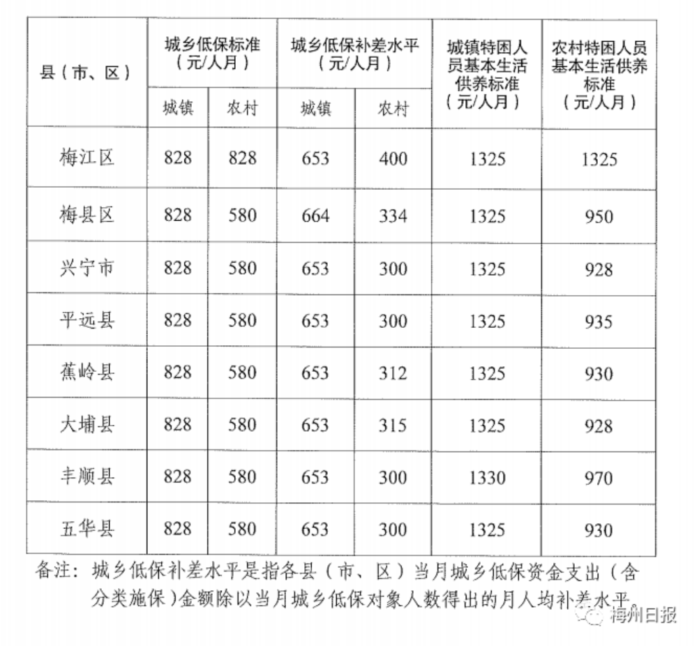 《2022年梅州市城鄉低保最低標準和特困人員基本生活供養標準》