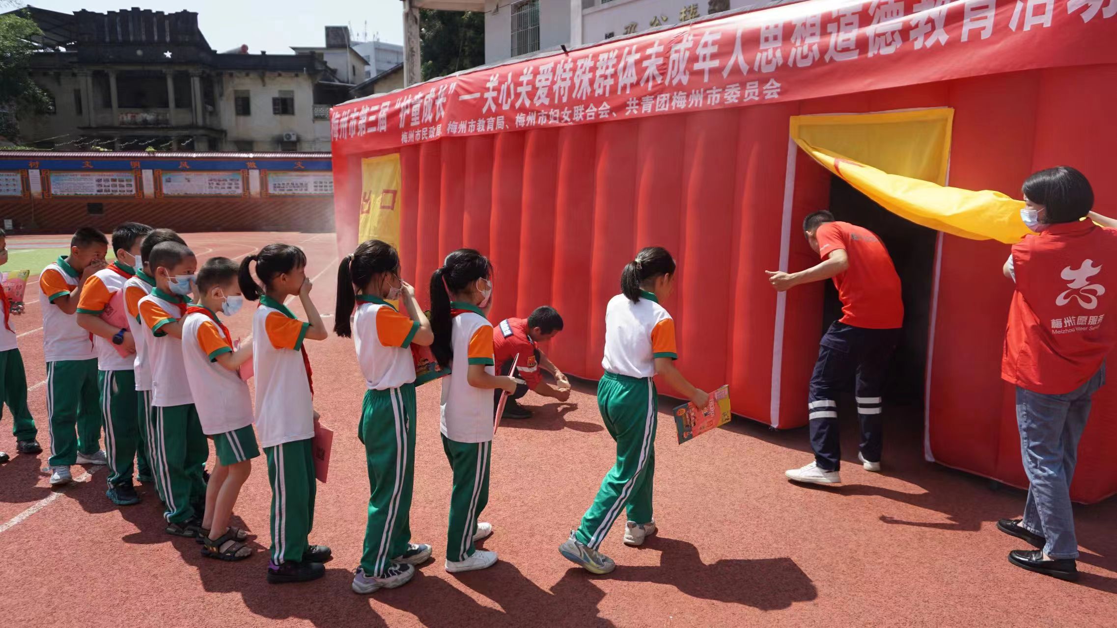 在梅州市特殊學校,學生在誌願者們的帶領下度過一次難忘的生日,活動播放防拐騙視頻,讓聾啞兒童加強防範意識;在梅江區城北鎮中心小學,學生在應急誌願者帶領下學習手工剪紙,加強孩子對非遺文化的保護和傳承的興趣;在梅縣區鬆口鎮中心小學,應急誌願者將火場逃生屋帶進學校,讓孩子們切身體驗火災現場,學會正確的逃生方式;在平遠縣石正中心小學,學生通過聽《抗戰英雄王二小》的紅色故事……