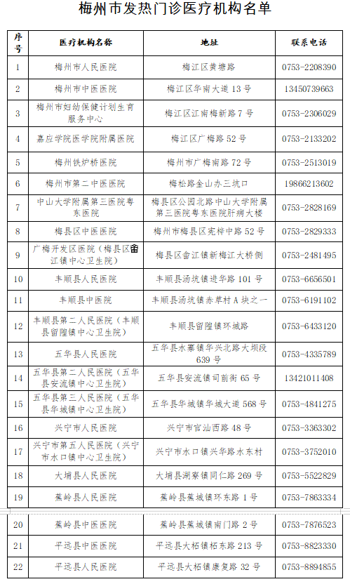 各縣(市、區)發熱門診名單及地址、聯係方式