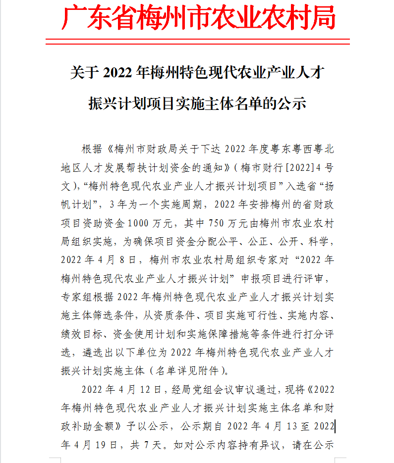 關於2022年梅州特色現代農業產業人才振興計劃項目實施主體名單的公示