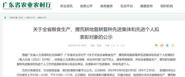 5月4日,廣東省農業農村廳官網發布公告,全省糧食生產、撂荒耕地複耕複種先進集體和先進個人擬表彰對象正在公示,擬表彰40個先進集體、80名先進個人。其中,梅州4個集體、5名個人入選名單。