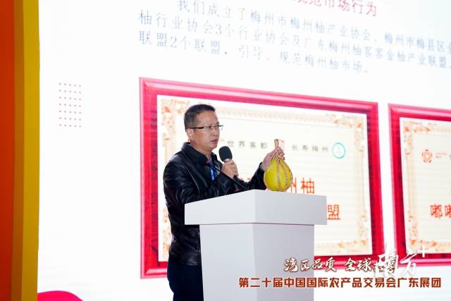陳愛東介紹,在廣東省農業農村廳的指導和大力支持下,梅州深入實施“12221”市場營銷體係,聚焦梅州柚產銷對接,圍繞拓展銷區和產區“2”大市場,一手抓生產、一手抓市場,進一步優化布局、擴大規模、壯大龍頭、做強品牌、提升效益,使梅州柚產業成為梅州市農業支柱產業和千家萬戶增收致富的“搖錢樹”“幸福果”。當前,梅州正在打造五顆柚:節慶柚、親情柚、長壽柚、蘇區柚、致富柚,並通過發展柚產品深加工,推動柚產業高質量發展,助力梅州“百千萬工程”深入實施。