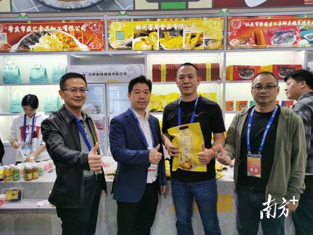 梅州客居食品有限公司、廣東大粵茗珠農業科技有限公司、廣東梅州金柚集團有限公司等農企攜梅州“土特產”客家鹽焗雞、客家炒綠、梅州金柚、客家預製菜等參會,國家地理標誌產品清涼山茶、客都草魚、大埔蜜柚等一同亮相。