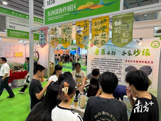 博覽會首日,新式茶飲攤位前遊人絡繹不絕。“好喝!”“客家炒綠炭燒奶茶挺有特色,沒有咖啡卻又咖啡的味道。”……在品嚐梅州展團的新式茶飲後,遊客紛紛點讚。