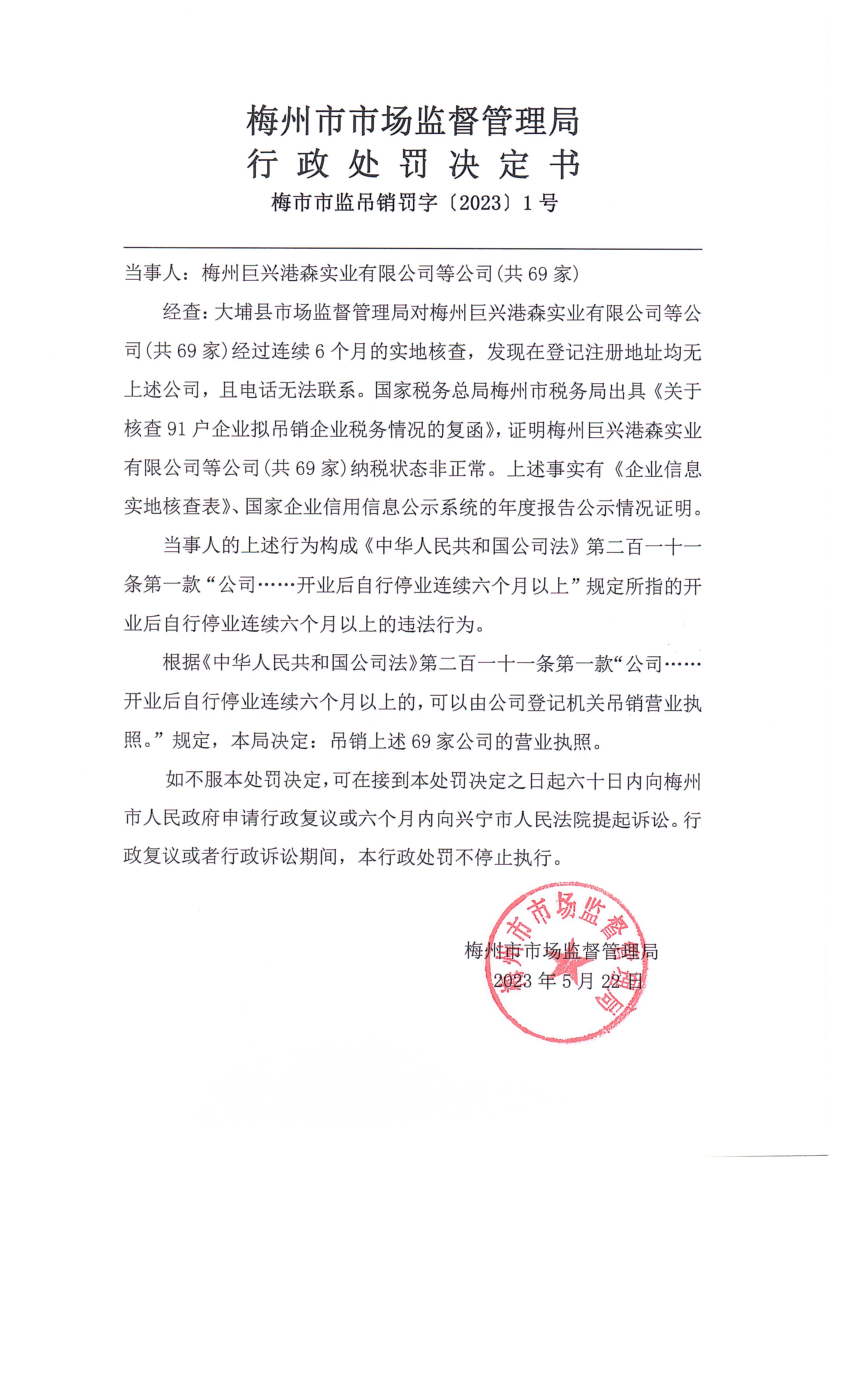 梅州市人民政府門戶網站 梅州市市場監督管理局 通知公告 關於送達《梅州市市場監督管理局行政處罰決定書》(梅市市監吊銷罰字〔2023〕1號)的公告