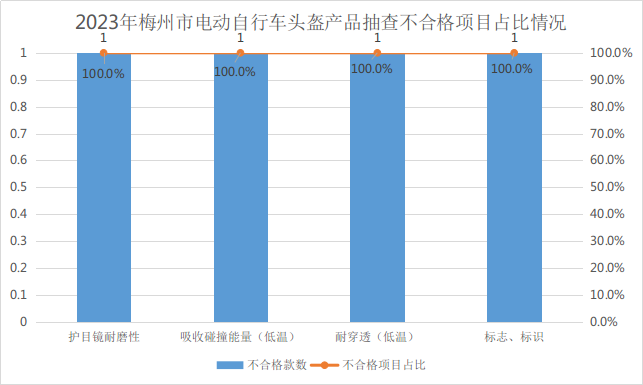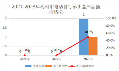 本次共對2家企業生產的2款電動自行車頭盔產品進行抽查檢驗,經檢驗,1款產品不合格,不合格檢出率分別為50%,2021年、2022年均未開展抽查。