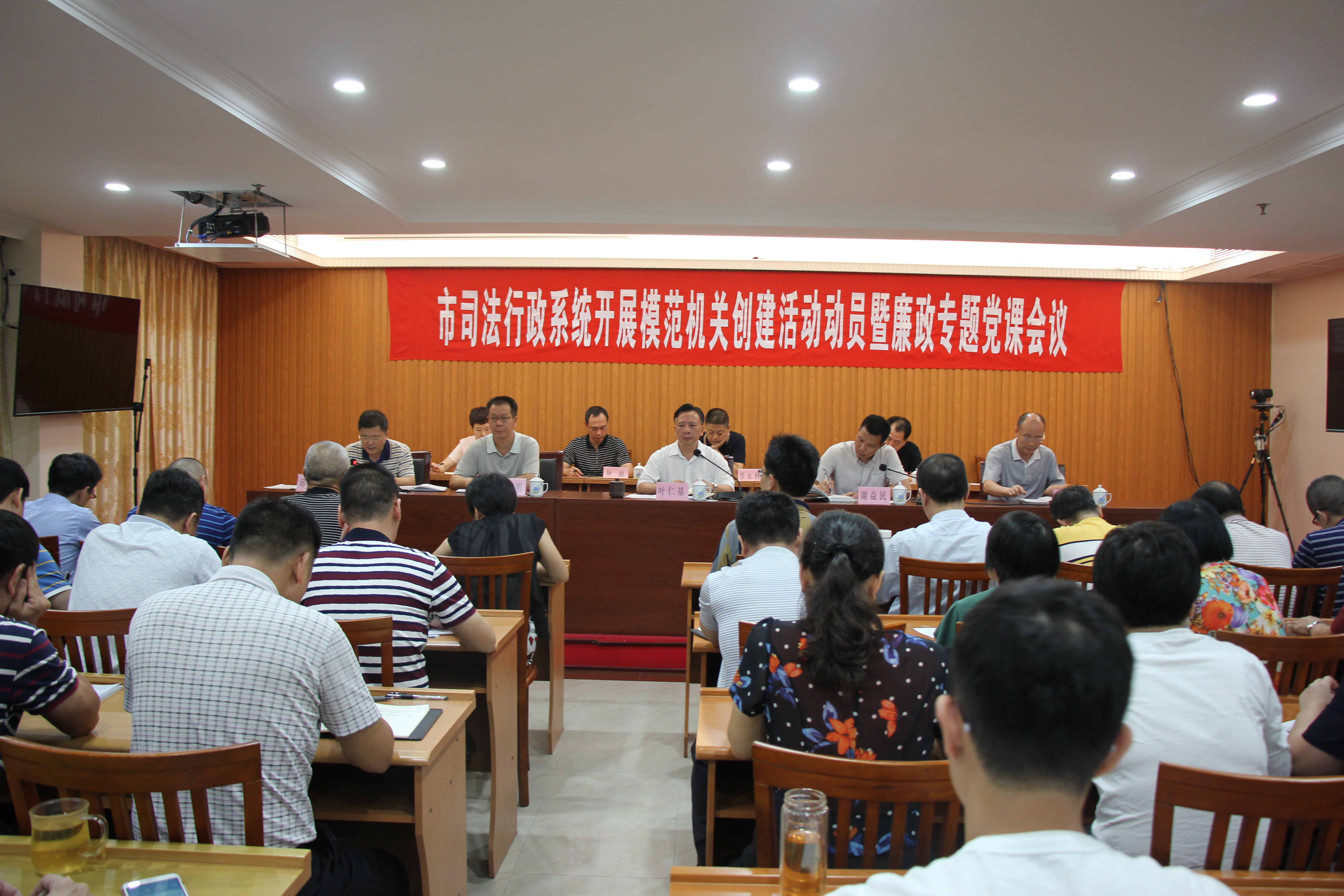 8月7日下午,市司法局召開創建模範機關活動動員暨廉政專題黨課會議。局黨組成員、政治處主任邱小軍同誌對2019-2020年開展模範機關創建活動作動員部署,局黨組書記、局長葉仁基同誌就加強司法行政係統黨風廉政建設暨模範機關創建作專題黨課,局領導、局機關全體幹部職工及所屬單位負責人共60多人參加了會議。會議由黨組成員、副局長謝益民同誌主持。