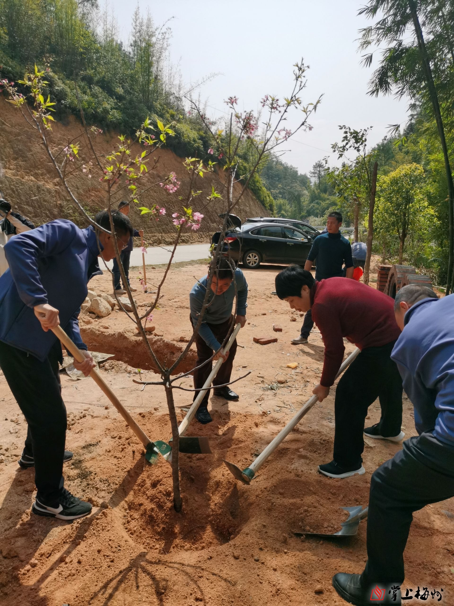 在植樹活動現場,大家迎著暖陽,共同勞作,相互配合,有的挖坑鬆泥,有的扶樹培土,有的澆水養護,一起種下桂花、櫸木、桃花等樹苗70多株,為“法治林”建設揮灑汗水。