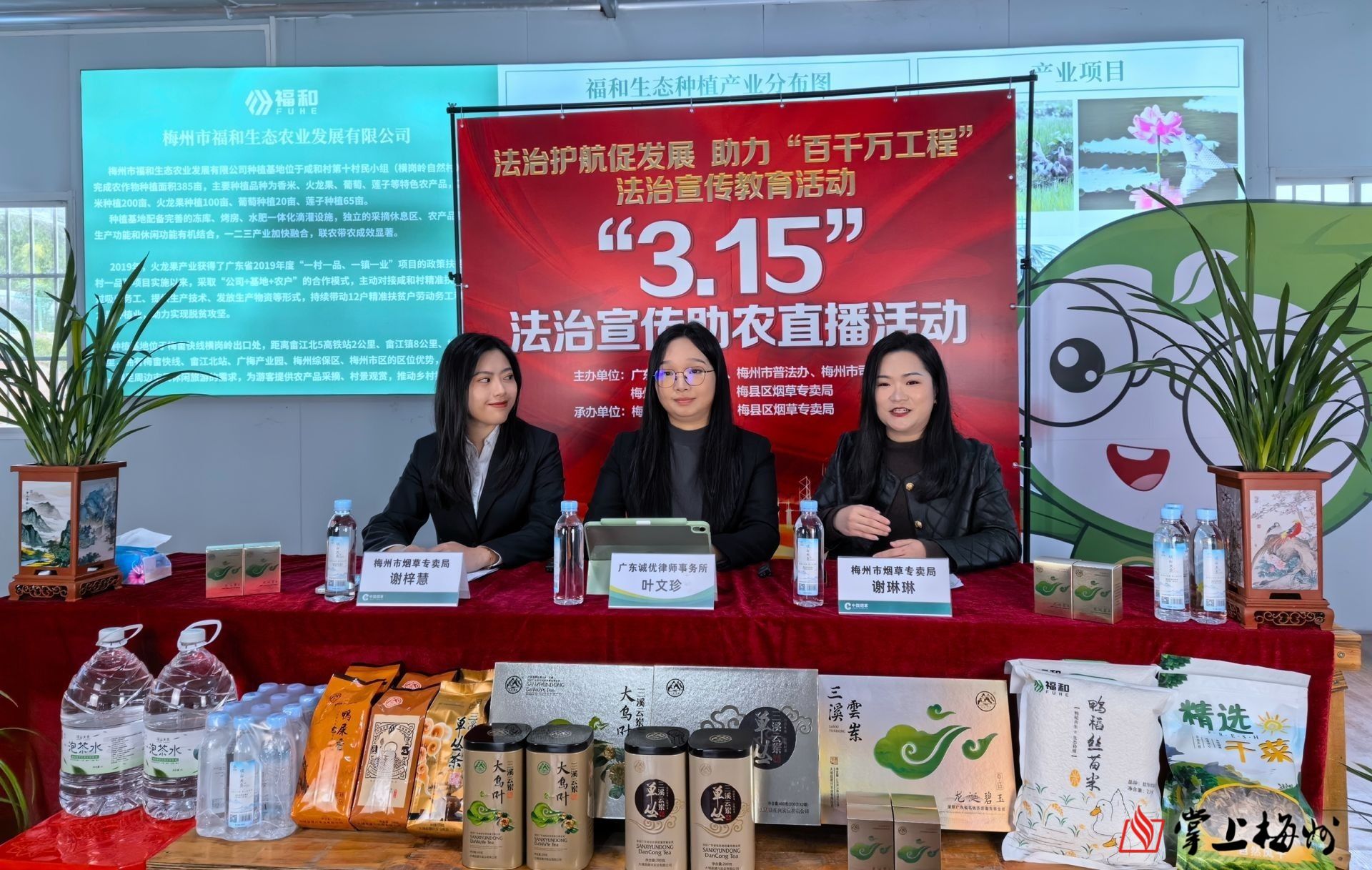3月15日上午,由廣東省煙草專賣局、梅州市普法辦、梅州市司法局、梅州市煙草專賣局、梅縣區煙草專賣局聯合主辦的3·15“法治護航促發展 助力百千萬工程”法治宣傳助農直播活動在省“民主法治示範村”梅州市梅縣區佘江鎮鹹和村進行。