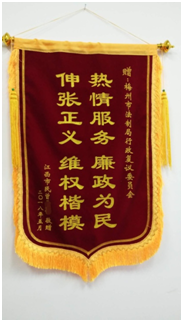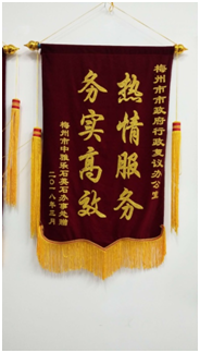 近日,複議案件申請人陳某將一麵寫有“不畏艱難,捍衛正義”的錦旗送到梅州市人民政府行政複議委員會辦公室(設在市法製局),對市政府行政複議委員會及我局複議工作人員表示衷心感謝。據不完全統計,自市政府行政複議委員會成立以來,已收到群眾送來錦旗十幾麵(今年收到三麵)。