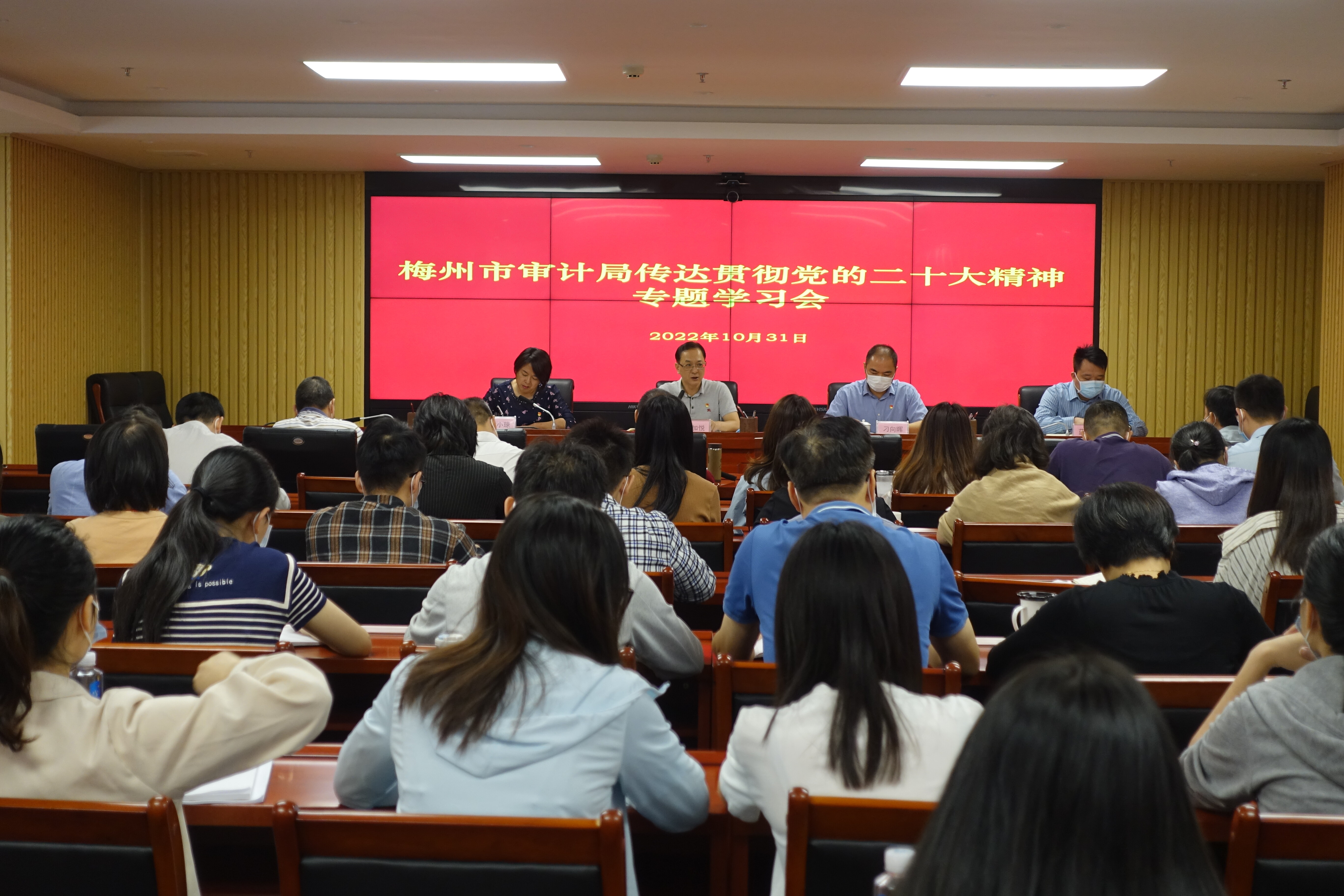 會議指出,要把學習宣傳貫徹黨的二十大精神作為首要政治任務抓緊抓實。全局上下要深入學習領會黨的二十大報告的精神實質、豐富內涵,深刻領悟“兩個確立”的決定性意義,進一步增強“四個意識”、堅定“四個自信”、做到“兩個維護”,堅定不移在思想上政治上行動上與黨中央保持高度一致。要堅持知信行統一,精心部署組織。領導班子、領導幹部要以身作則,帶頭並引導廣大審計幹部認真研讀黨的二十大報告和新黨章,準確把握黨的二十大精神的思想精髓、核心要義;黨總支、黨支部要運用“三會一課”、集中學習、個人自學等方式,持續興起學習宣傳貫徹熱潮;各科(室、中心)負責人要統籌抓好學習和工作,把黨的二十大精神貫徹落實到謀劃審計工作、實施審計項目全過程各環節。要堅持學思用貫通,狠抓工作落實。聚焦黨的二十大確定的目標任務,立足“審計監督首先是經濟監督”定位,突出服務實體經濟和鄉村振興兩大重點,依法全麵履行審計監督職責,做好常態化“經濟體檢”。並以開展“深入學習貫徹黨的二十大精神,以研究型審計推動梅州蘇區高質量發展”主題征文活動為抓手,創建學習型、研究型、攻關型、服務型模範機關,樹立大抓研究的鮮明導向,推動審計事業的高質量發展。