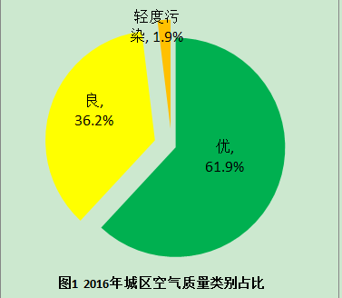 2016年梅州市城區環境空氣質量有效監測天數365天。AQI範圍20-112,其中,空氣質量優的天數為226天,良的天數132天,輕度汙染7天,優良天數比例98.1%,較去年同期上升2.0個百分點。城市環境空氣質量綜合指數為3.21,在全省21個地級市中排第4名。