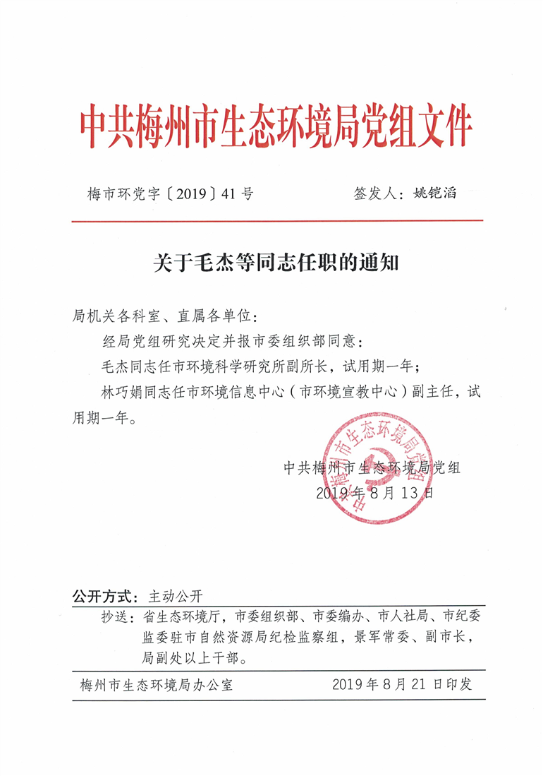 梅州市人民政府門戶網站 梅州市生態環境局 人事信息 關於毛傑等同誌任職的通知