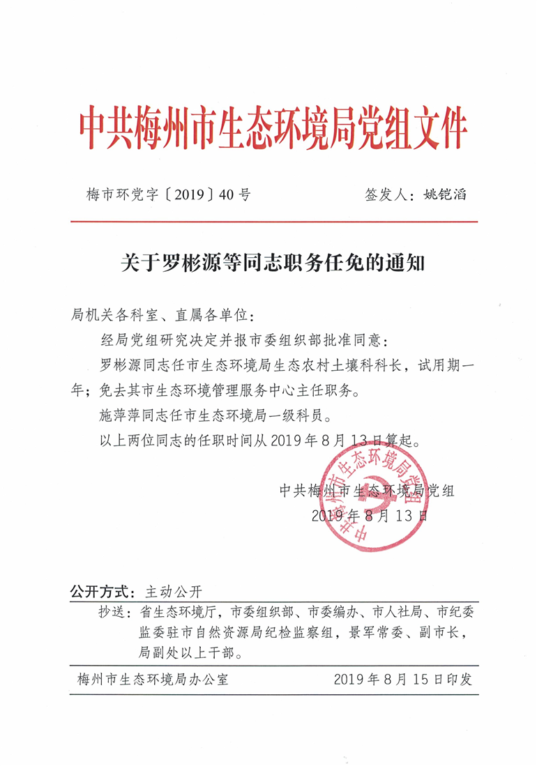梅州市人民政府門戶網站 梅州市生態環境局 人事信息 關於羅彬源等同誌職務任免的通知