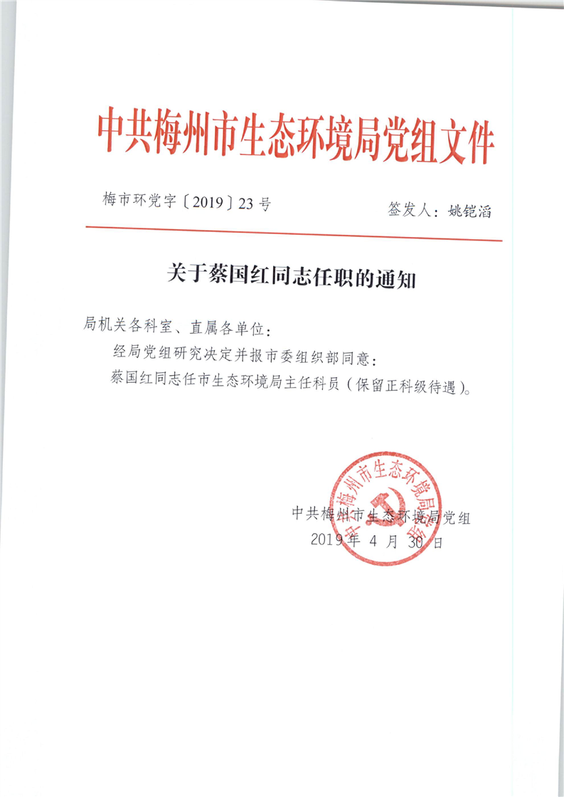 梅州市人民政府門戶網站 梅州市生態環境局 人事信息 關於蔡國紅同誌任職的通知