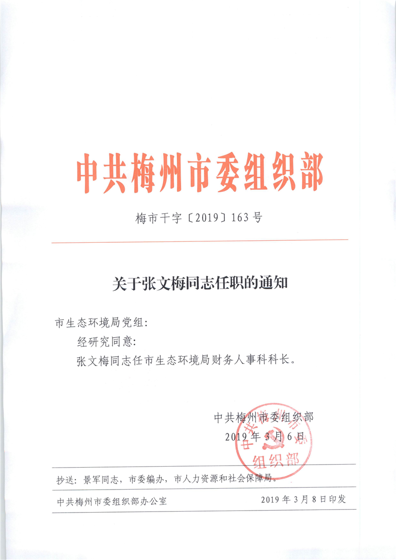 梅州市人民政府門戶網站 梅州市生態環境局 人事信息 關於張文梅同誌任職的通知