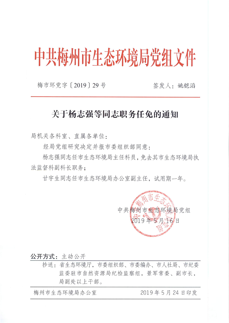 梅州市人民政府門戶網站 梅州市生態環境局 人事信息 關於楊誌強等同誌職務任免的通知
