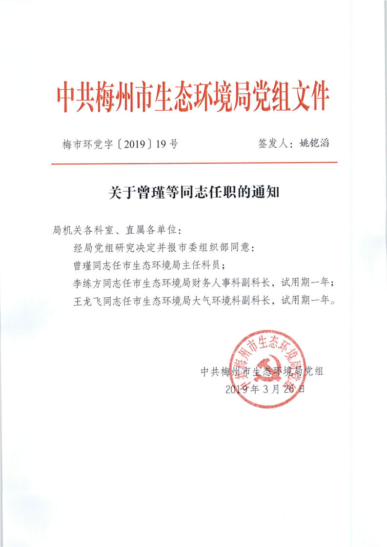 梅州市人民政府門戶網站 梅州市生態環境局 人事信息 關於曾瑾等同誌任職的通知